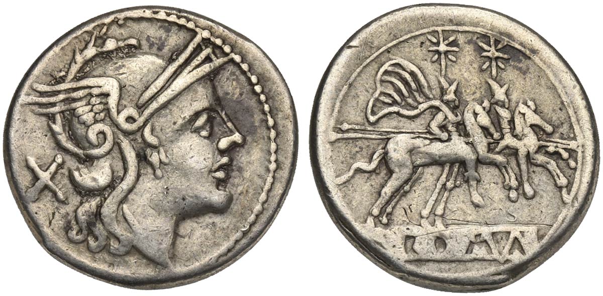 Anonymous, Denarius, Rome, 211-208 BC. AR (g 4,43; mm 20; h 11). Helmeted head of Roma r.; denomination mark behind, Rv. The Dioscuri, each holding spear, on horseback r.; ROMA incuse below. Crawford 44/5; RSC 2; Sydenham 140. Very fine