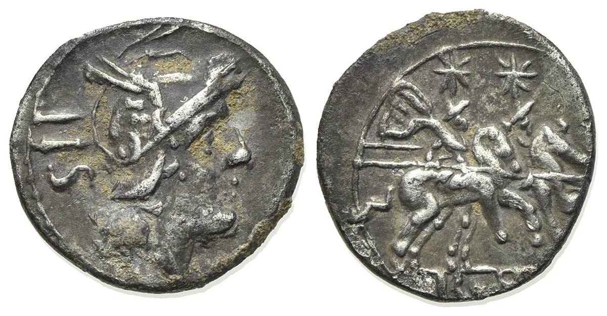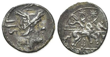Anonymous, Sestertius, Rome, 211-208 BC. AR (g 1,05; mm 12; h 9). Helmeted head of Roma r.; IIS behind, Rv. The Dioscuri, each holding spear, on horseback r.; two stars above; below, ROMA in linear frame. Crawford 44/7; RSC 4; Sydenham 142. Very fine