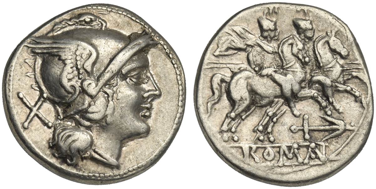 Anchor series, Denarius, Rome, 209-208 BC. AR (g 4,22; mm 18; h 11). Helmeted head of Roma r.; denomination mark behind, Rv. The Dioscuri, each holding spear, on horseback r.; two stars above, anchor below; ROMA below. Crawford 50