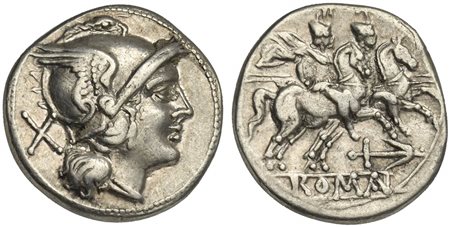Anchor series, Denarius, Rome, 209-208 BC. AR (g 4,22; mm 18; h 11). Helmeted head of Roma r.; denomination mark behind, Rv. The Dioscuri, each holding spear, on horseback r.; two stars above, anchor below; ROMA below. Crawford 50/2; RSC 20a; Sydenham 144. Good very fine
