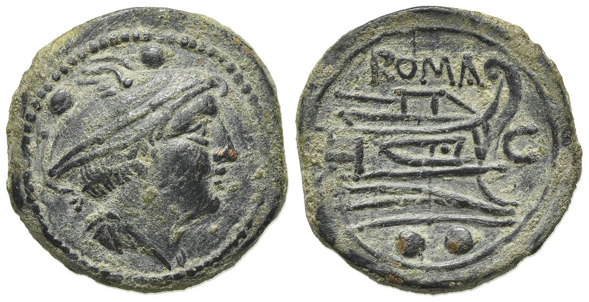 C series, Sardinia, Sextans, ca. 211 BC. AE (g 4,28; mm 19; h 12). Head of Mercury r. wearing winged petasus; Rv. Prow of galley r.; C before. Crawford 63/6; RBW 264. Green patina, extremely fine