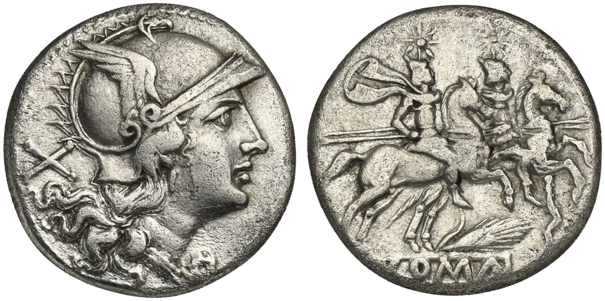 Grain-ear series, Denarius, Sicily, 209-208 BC. AR (g 3,71; mm 18; h 7). Helmeted head of Roma r., Rv. The Dioscuri on horseback riding r.; grain ear and crooked staff below horses; ROMA. Crawford 77/1; RSC 20m*; Sydenham 225. Ext