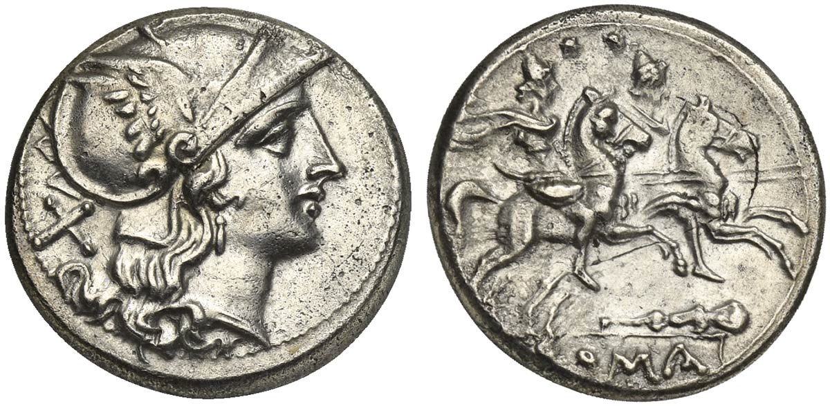Club seris, Denarius, Rome, 208 BC. AR (g 4,36; mm 18; h 10). Helmeted head of Roma r.; denomination mark behind, Rv. The Dioscuri, each holding spear, on horseback r.; two stars above, club below; ROMA below. Crawford 89/2; RSC 2