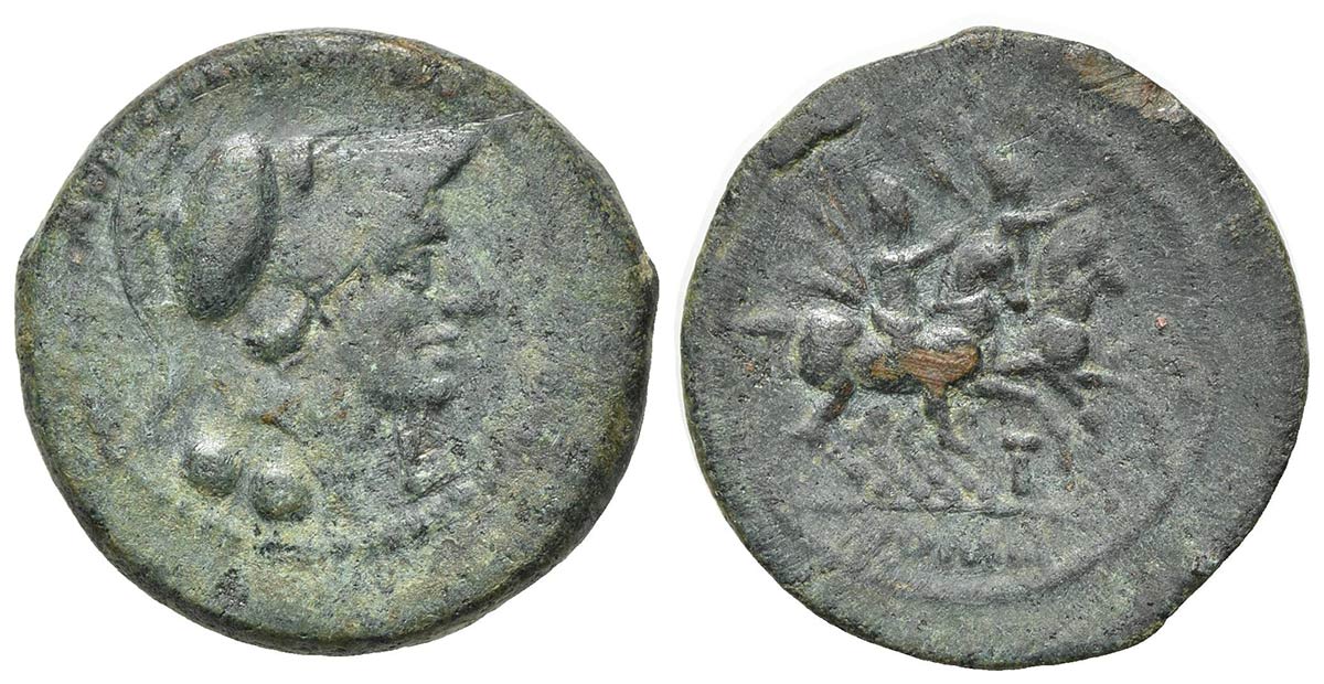 LT series, Sextans, Luceria, 211-210 BC. AE (g 10.57, mm 25, h 9). Head of Minerva r., wearing Corinthian helmet; L below chin, two pellets