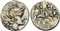 Pentagram series, Denarius, Uncertain mint, 206-200 BC. AR (g 3,12; mm 18; h 6). Helmeted head of Roma r.; denomination mark behind, Rv. The Dioscuri, each holding spear, on horseback r.; pentagram below, ROMA in exergue. Crawford