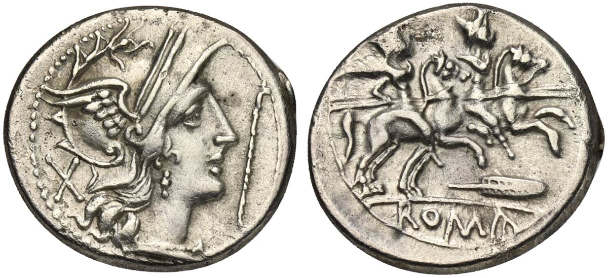 Staff and feather series, Denarius, Uncertain mint, c. 206-200 BC. AR (g 3,24; mm 19; h 6). Helmeted head of Roma r.; denomination mark behind, staff before, Rv. The Dioscuri, each holding spear, on horseback r.; two stars above, feather below; ROMA below. Crawford 130/1; RSC 20ee; Sydenham 206. Good very fine