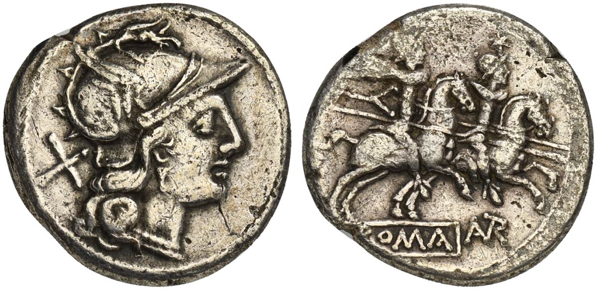 L. Autronius, Denarius, Rome, 189-180 BC. AR (g 3,62; mm 19; h 6). Helmeted head of Roma r., denomination mark behind, Rv. The Dioscuri, each holding spear, on horseback right; two stars above, AVTR monogram below, ROMA in exergue