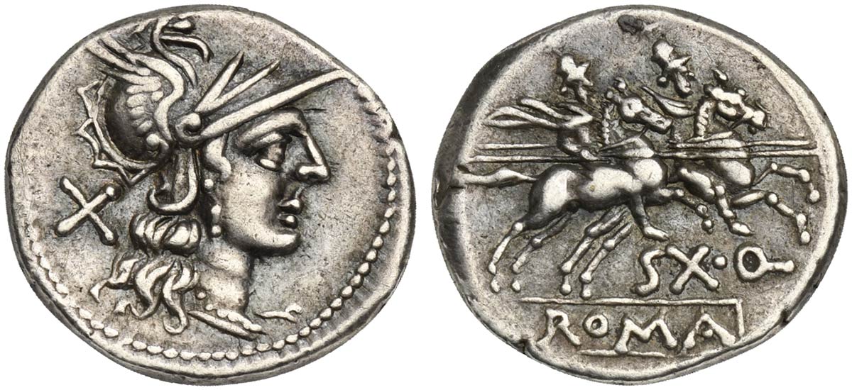 Sex. Quinctilius, Denarius, Rome, 189-180 BC. AR (g 4,09; mm 19; h 5). Helmeted head of Roma r.; denomination mark behind, Rv. The Dioscuri riding r.; SX • Q below, ROMA in linear frame below. Crawford 152/1b; Quinctilia 1; Sydenham 287. About extremely fine