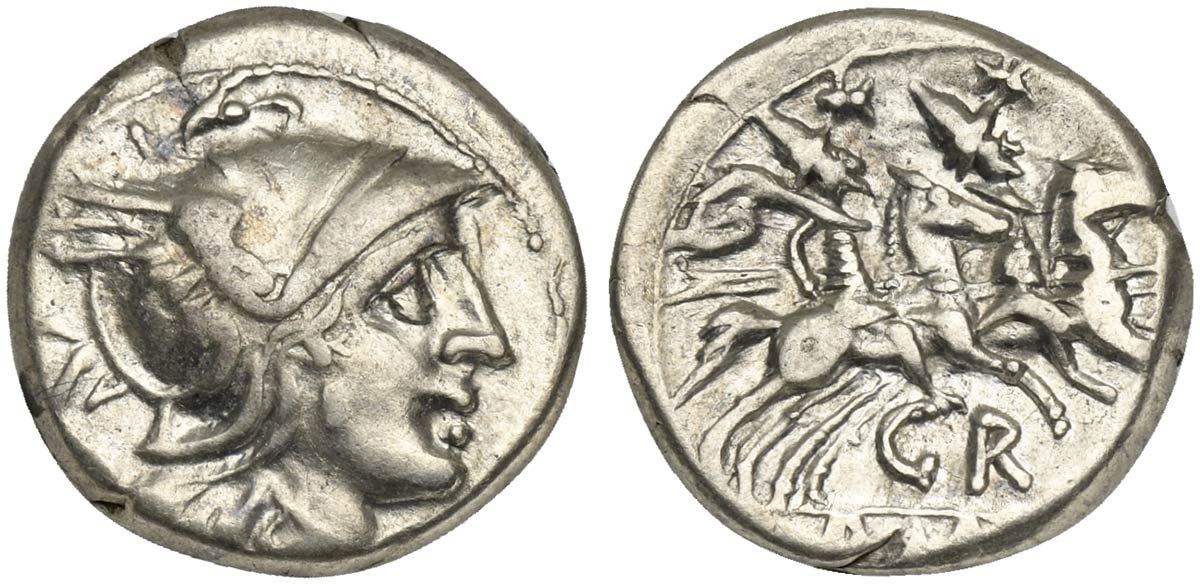 GR series, Denarius, Uncertain mint, 199-170 BC. AR (g 4,64; mm 18; h 9). Helmeted head of Roma r.; denomination mark behind, Rv. The Dioscuri, each holding spear, on horseback r.; GR below horses, [ROMA] in exergue. Crawford 169/