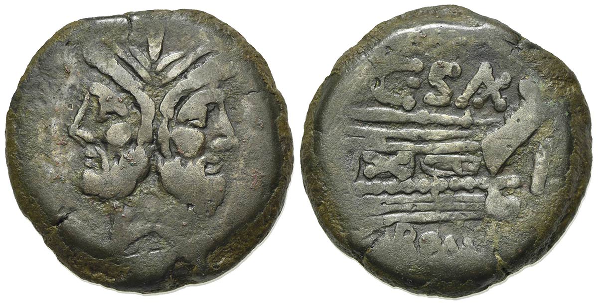 C. Cluvius Saxula, As, Rome, 169-158 BC. AE (g 35.08; mm 33.5; h 12). Laureate head of bearded Janus; Rv. Prow of galley r.; C•S(AX) above, ROMA below. Crawford 173/1; Sydenham 360; RBW 732. Very fine