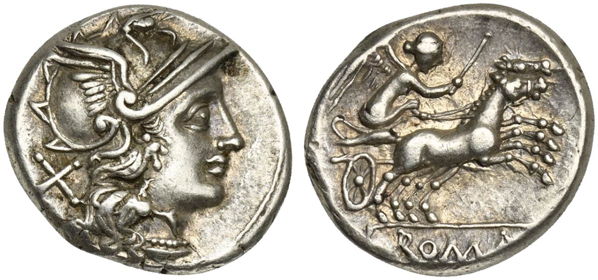 Lot 681 | Anonymous, Denarius, Rome, ca. 157/6 BC. AR (g 3,87; mm 17; h 6). Helmeted head of Roma r.; denomination mark behind, Rv. Victory driving biga r.; ROMA in exergue. Crawford 197/1a; RSC 6; Sydenham 376. Good very fine
