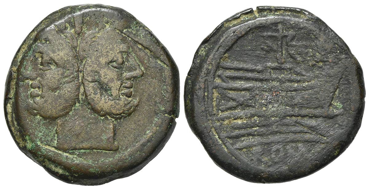 Mast and sail series, As, Rome, c. 155-149 BC. AE (g 20,85; mm 29,5; h 9). Laureate head of bearded Janus; Rv. Prow of galley r.; mast with sail above; ROMA below. Crawford 213/1; Sydenham -. Scarce, very fine