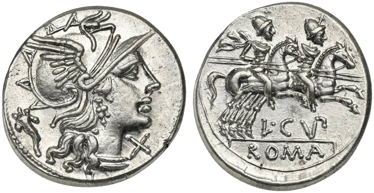 L. Cupiennius, Denarius, Rome, 147 BC. AR (g 3,99; mm 19; h 3). Helmeted head of Roma r.; cornucopia behind, denomination mark before, Rv. The Dioscuri, each holding spear, on horseback r.; two stars above; L•C(VP) below, ROMA in