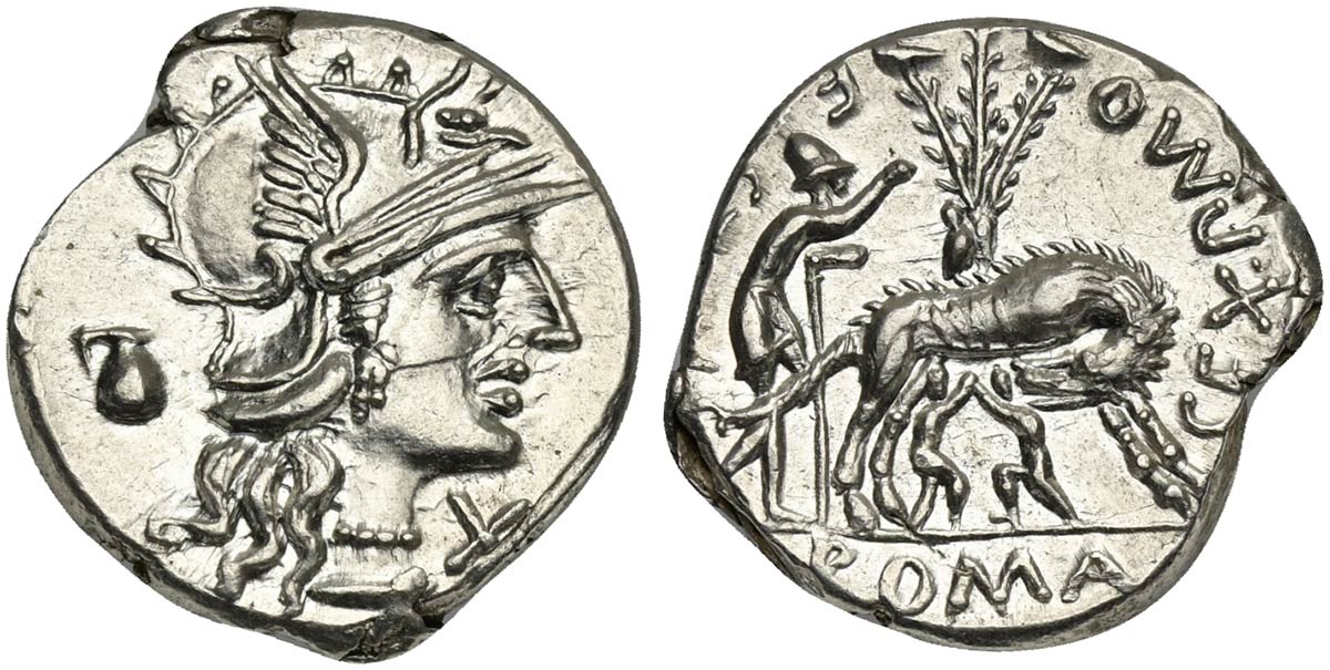 Lot 700 | Sex. Pompeius Fostlus, Denarius, Rome, 137 BC. AR (g 3,99; mm 20; h 10). Helmeted head of Roma r.; capis to l., denomination mark before, Rv. She-wolf standing r., head l., suckling the twins (Remus and Romulus); to l., shepherd F