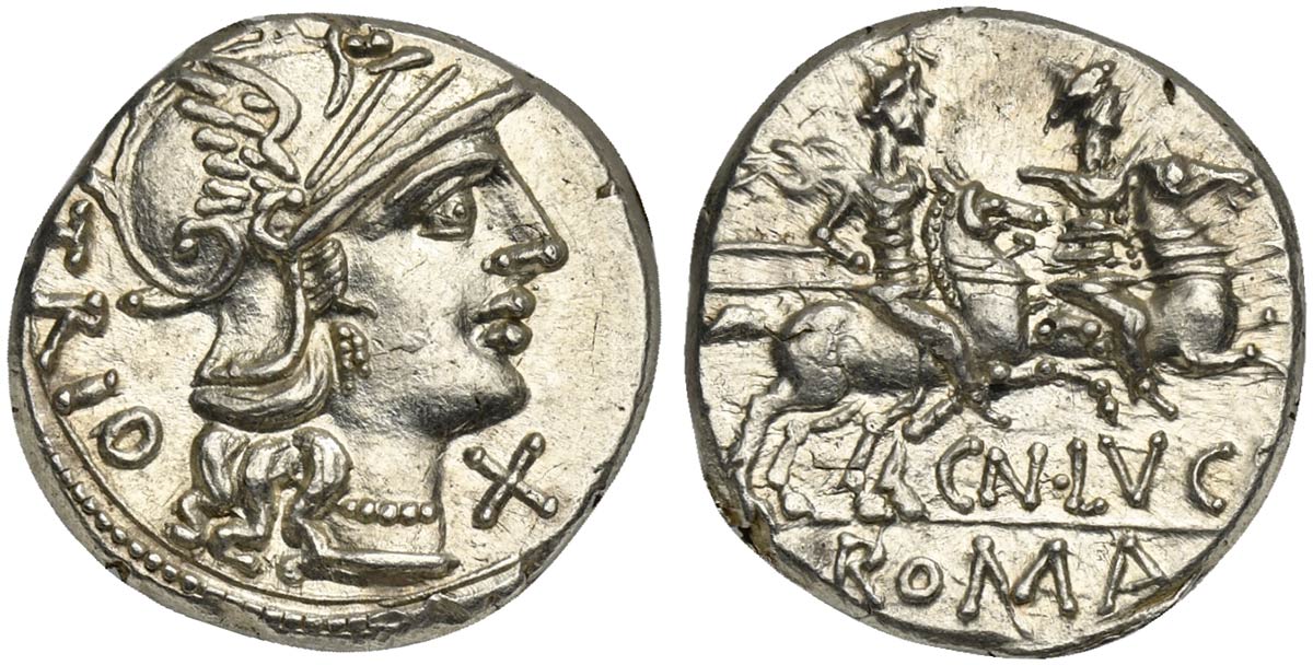 Cn. Lucretius Trio, Denarius, Rome, 136 BC. AR (g 3,95; mm 19; h 4). Helmeted head of Roma r.; TRIO behind, denomination mark before, Rv. Dioscuri on horseback riding r.; CN•LVC[R] below, ROMA in exergue. Crawford 237/1a; Lucretia