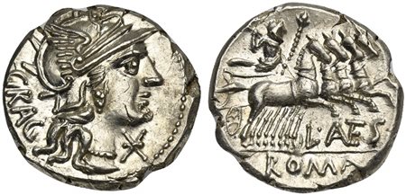 L. Antestius Gragulus, Denarius, Rome, 136 BC. AR (g 3,78; mm 19; h 5). Helmeted head of Roma r.; GRAG behind, denomination mark below chin, Rv. Jupiter driving quadriga r., holding reins and sceptre and preparing to hurl thunderb