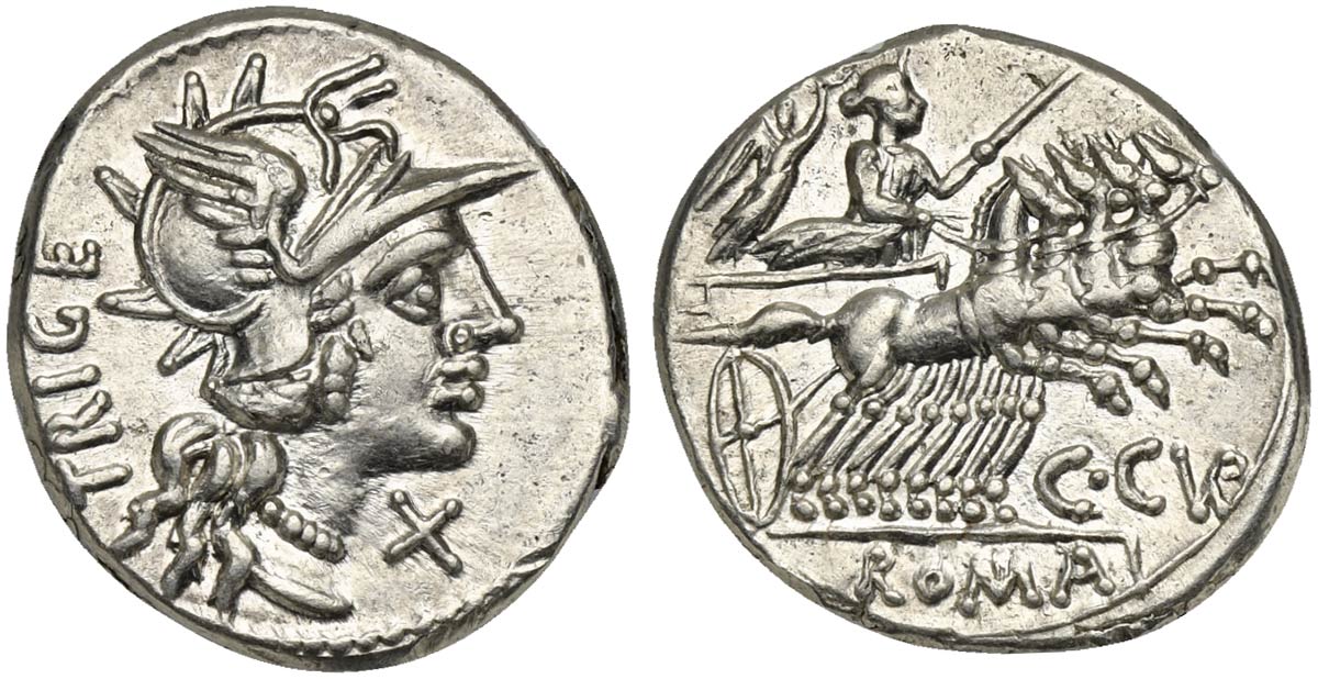 C. Curiatius f. Trigeminus, Denarius, Rome, 135 BC. AR (g 3,58; mm 20; h 9). Helmeted head of Roma r.; TRIGE behind, denomination mark before, Rv. Juno driving galloping quadriga r., being crowned by Victory from behind, holding r