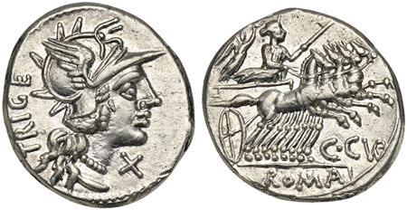 C. Curiatius f. Trigeminus, Denarius, Rome, 135 BC. AR (g 3,58; mm 20; h 9). Helmeted head of Roma r.; TRIGE behind, denomination mark before, Rv. Juno driving galloping quadriga r., being crowned by Victory from behind, holding reins and sceptre; C•C(VR) below, ROMA in linear frame below. Crawford 240/1b; Curiatia 2a; Sydenham 459a. Extremely fine