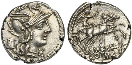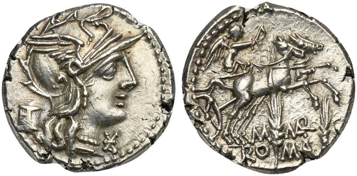 M. Marcius Mn.f., Denarius, Rome, 134 BC. AR (g 3,93; mm 20; h 6). Helmeted head of Roma r.; modius behind, denomination mark before, Rv. Victory in biga r.; two corn ears below; M •(MAR) C / RO MA below. Crawford 245/1; Marcia 8;