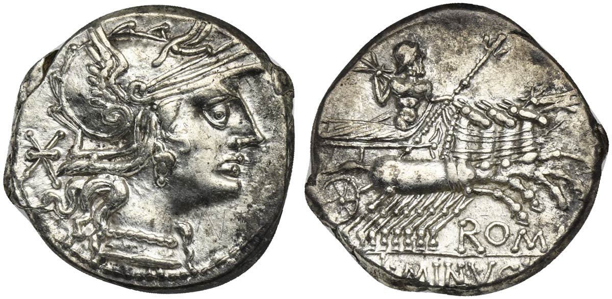 L. Minucius, Denarius, Rome, 133 BC. AR (g 3,86; mm 21; h 7). Helmeted head of Roma r.; denomination mark behind, Rv. Jupiter driving galloping quadriga r., hurling thunderbolt and holding sceptre; ROM[A] below, L•MINVCI in exergue. Crawford 248/1; Minucia 15; Sydenham 470. Very fine