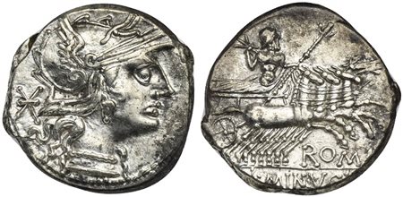 L. Minucius, Denarius, Rome, 133 BC. AR (g 3,86; mm 21; h 7). Helmeted head of Roma r.; denomination mark behind, Rv. Jupiter driving galloping quadriga r., hurling thunderbolt and holding sceptre; ROM[A] below, L•MINVCI in exergu