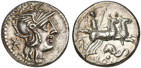 L. Caecilius Metellus Diadematus, Denarius, Rome, 128 BC. AR (g 3,96; mm 18; h 2). Helmeted head of Roma r.; denomination mark behind, Rv. Pax driving galloping biga r., holding olive branch, sceptre, and reins; below, elephant’s head r., wearing bell, and ROMA. Crawford 262/1; Caecilia 38; Sydenham 496. Good very fine