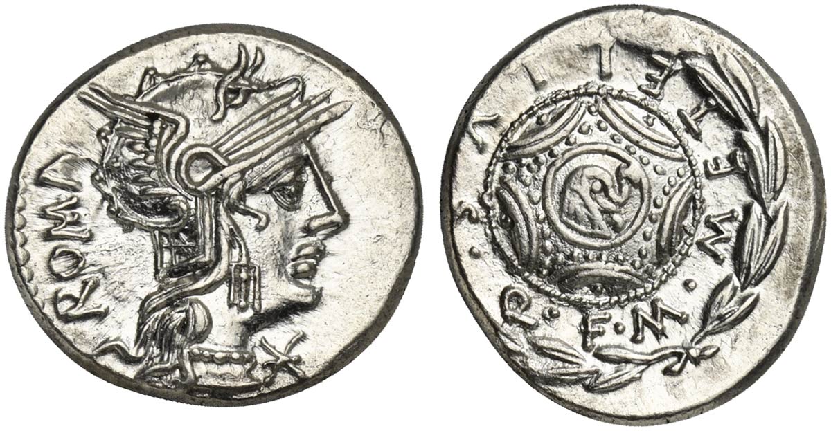M. Caecilius Q.f. Q.n. Metellus, Denarius, Rome, 127 BC. AR (g 3,92; mm 18; h 11). Helmeted head of Roma r., star on flap; to l., ROMA upwards, denomination mark before, Rv. Macedonian shield with elephant's head in central boss; M•METELLVS Q•F around, all in laurel wreath. Crawford 263/1a; Caecilia 29; Sydenham 480. Lustrous, rev. slightly off-centre, otherwise extremely fine