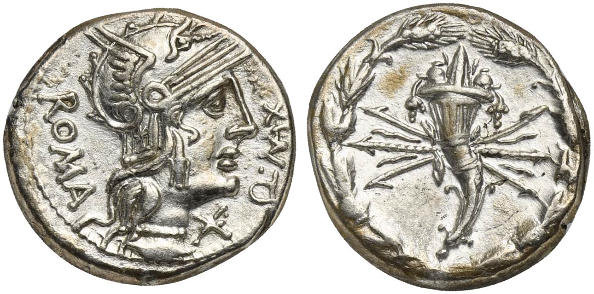 Lot 737 | Q. Fabius Maximus, Denarius, Rome, 127 BC. AR (g 3,82; mm 18; h 11). Helmeted head of Roma r.; ROMA behind, denomination mark and Q•MX, Rv. Cornucopia over thunderbolt; all within wreath. Crawford 265/1; Fabia 5; Sydenham 478. Nea
