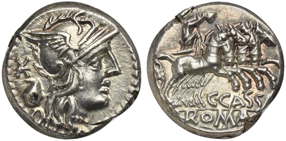 C. Cassius, Denarius, Rome, 126 BC. AR (g 3,96; mm 17; h 3). Helmeted head of Roma r.; denomination mark and voting urn behind, Rv. Libertas driving galloping quadriga r., holding reins, vindicta and pileus; C•CASSI below, ROMA in