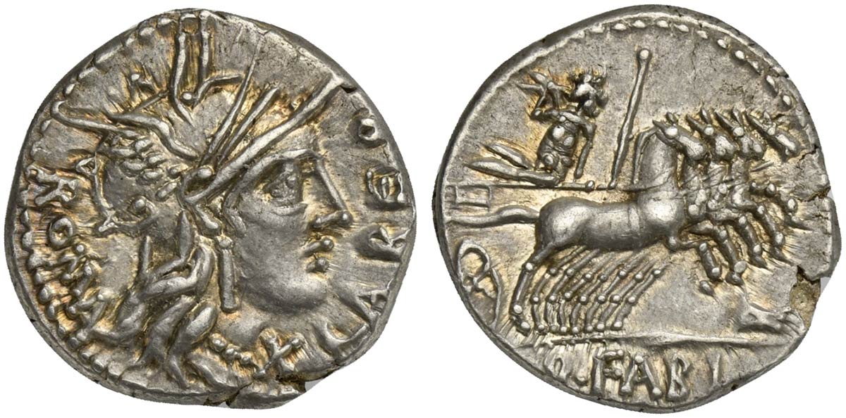 Q. Fabius Labeo, Denarius, Rome, 124 BC. AR (g 3,91; mm 18; h 3). Helmeted head of Roma r.; ROMA behind, denomination mark and LABEO before, Rv. Jupiter driving galloping quadriga r., hurling thunderbolt, holding sceptre and reins