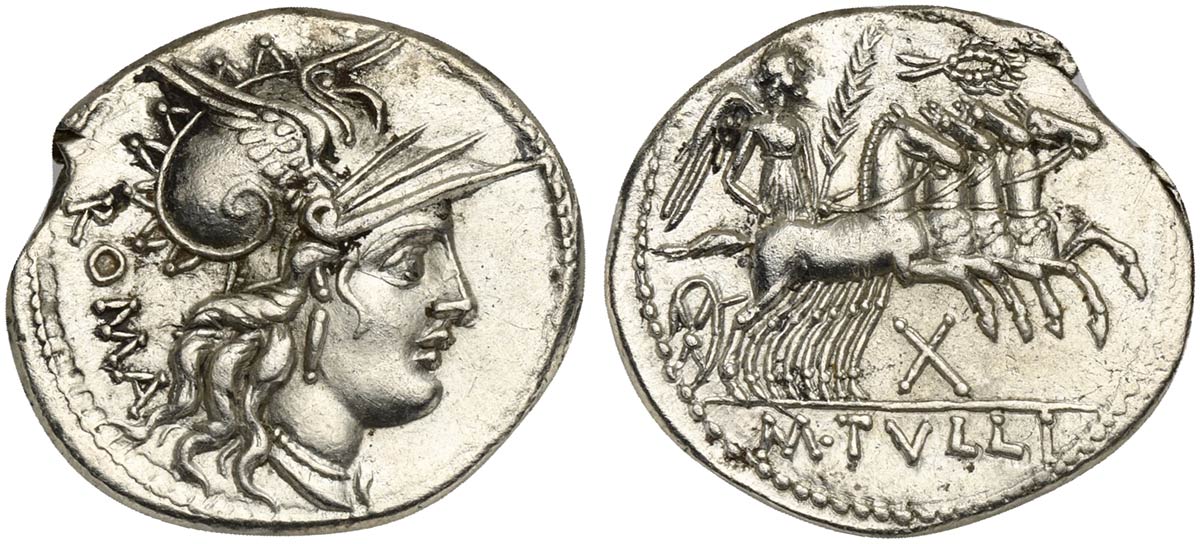 Lot 750 | M. Tullius, Denarius, Rome, 119 BC. AR (g 3,85; mm 22; h 1). Helmeted head of Roma r.; ROMA behind, Rv. Victory driving galloping quadriga r., holding palm frond and reins; wreath above; X below, M•TVLLI. Crawford 280/1; Tullia 1;