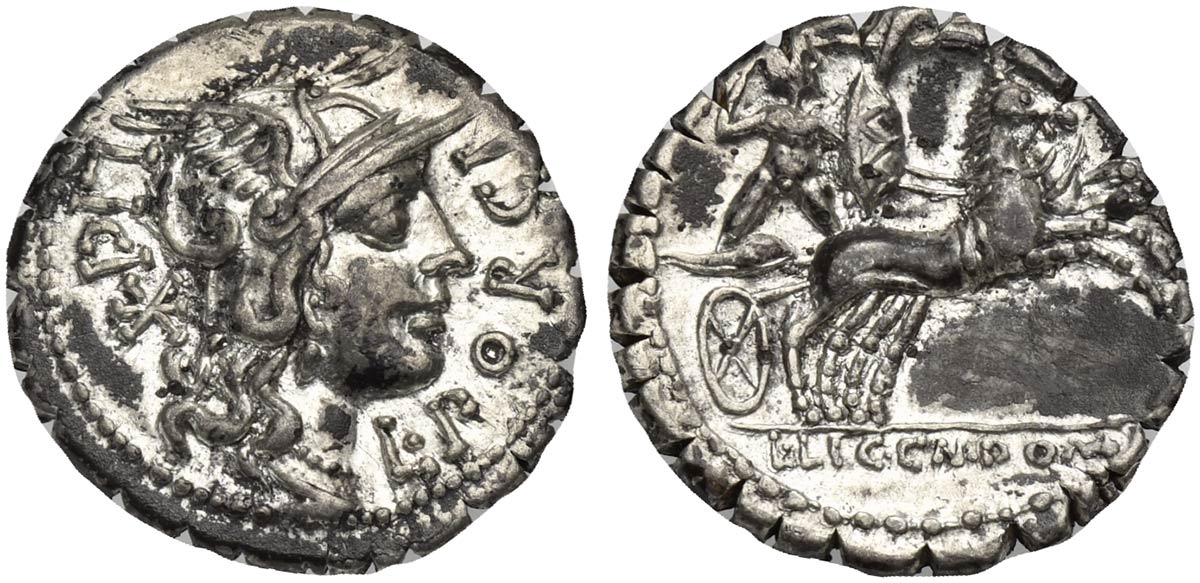 L. Porcius Licinus, Serrate Denarius, Rome, 118 BC. AR (g 3,89; mm 19; h 3). Helmeted head of Roma r.; L•PORCI•LICI around, denomination mark behind, Rv. Warrior, Bituitus, in galloping biga r., holding spear, shield and carnyx; L