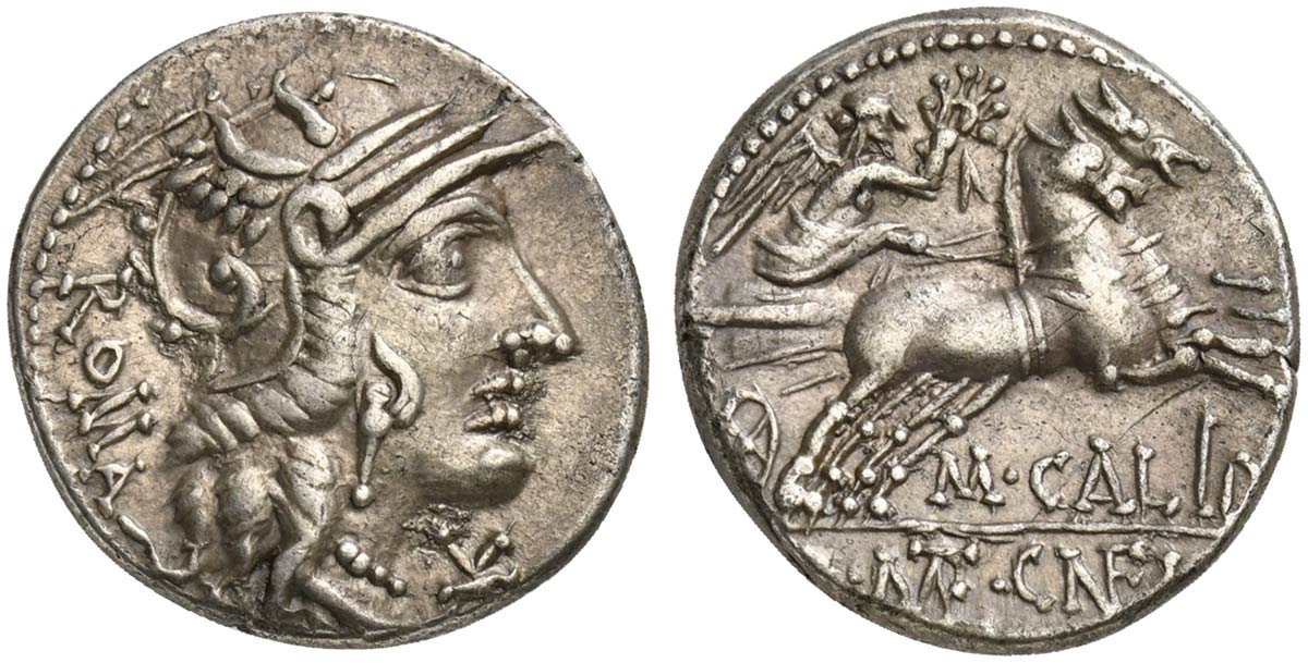 M. Calidius, Q. Metellus, and Cn. Fulvius, Denarius, Rome, 117-116 BC. AR (g 3,88; mm 18; h 2). Helmeted head of Roma r.; ROMA behind, denomination mark before, Rv. Victory driving biga r., holding reins and wreath; M•CALID below,