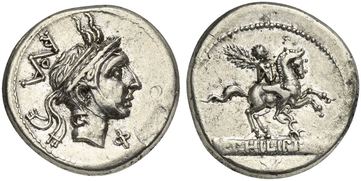 L. Philippus, Denarius, Rome, 113-112 BC. AR (g 3,64; mm 19; h 3). Head of Philip V of Macedon r., wearing diademed royal Macedonian helmet with goat horns; Roma monogram to l., Φ below chin, Rv. Equestrian statue r. on inscribed