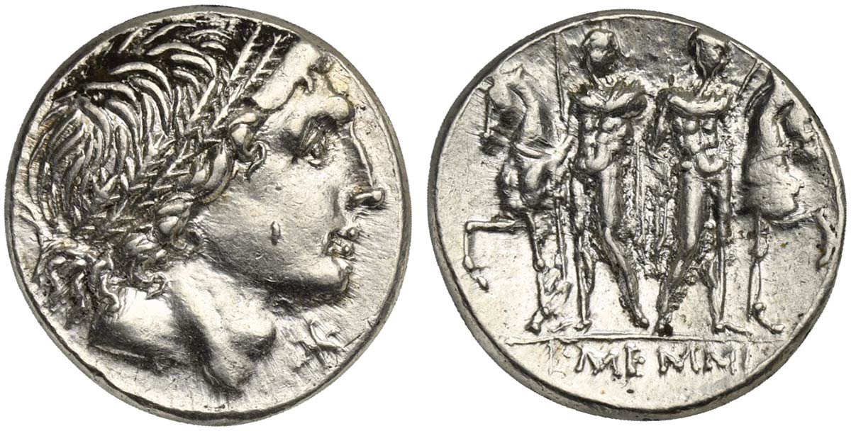 Lot 767 | L. Memmius, Denarius, Rome, 109-108 BC. AR (g 3,64; mm 19; h 8). Male head r., wearing oak wreath; denomination mark before, Rv. The Dioscuri standing facing before their horses, each holding a spear; L•MEMMI in exergue. Crawford