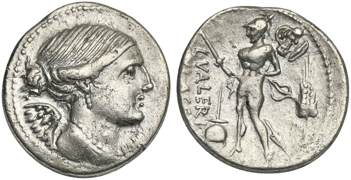 Lot 769 | L. Valerius Flaccus, Denarius, Rome, 108-107 BC. AR (g 3,82; mm 20; h 2). Winged and draped bust of Victory r.; denomination mark below chin, Rv. Mars advancing l., holding spear and trophy; apex to l., stalk of grain to r.; L•VAL