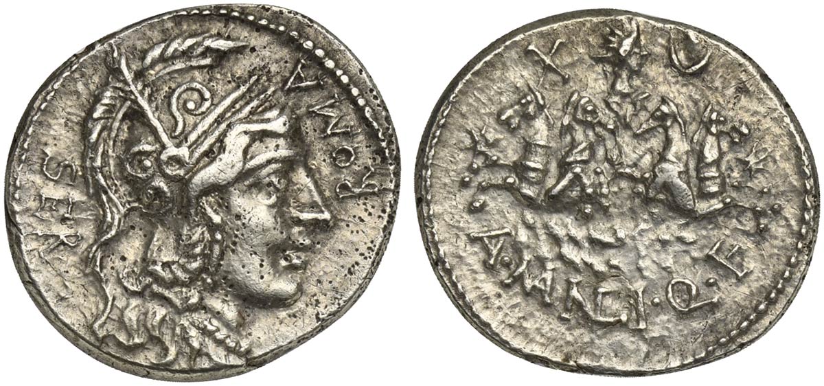 Lot 771 | A. Manlius Q.f. Sergianus, Denarius, Rome, 118-107 BC. AR (g 3,98; mm 21; h 7). Helmeted head of Roma r.; SER downward behind, ROMA upward before, Rv. Sol in facing quadriga rising from the waves of the sea; star on either side; X