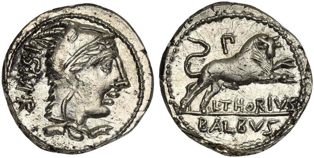 Lot 780 | L. Thorius Balbus, Denarius, Rome, ca. 105 BC. AR (g 4,05; mm 21; h 6). Head of Juno Lanuvium r., wearing goat skin; I•S•M•R behind, Rv. Bull charging r.; P above, L•THORIVS below, BALBVS in exergue. Crawford 316/1; Thoria 1; Syde