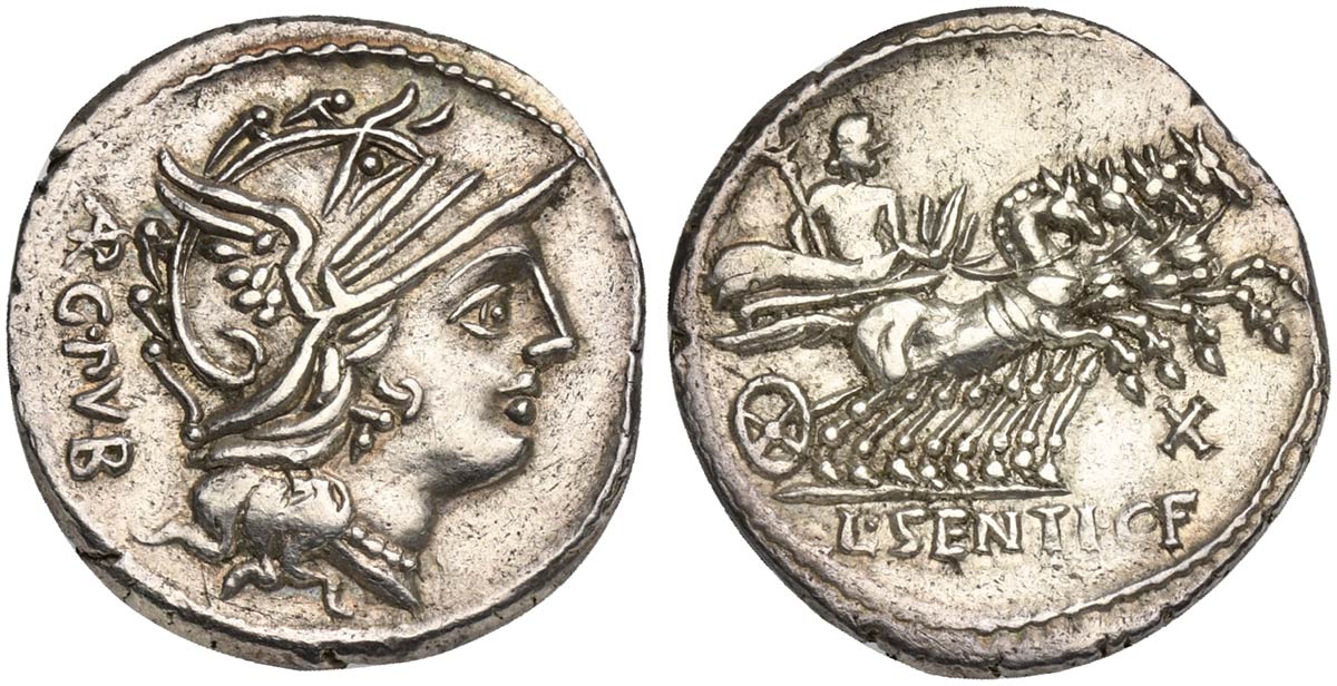L. Sentius C.f., Denarius, Rome, 101 BC. AR (g 4,00; mm 22; h 7). Helmeted head of Roma r.; (AR)G•PVB behind, Rv. Jupiter driving quadriga r.; X below horses, L•SENTI•C•F in exergue. Crawford 325/1b; Sentia 1; Sydenham 600. Good very fine