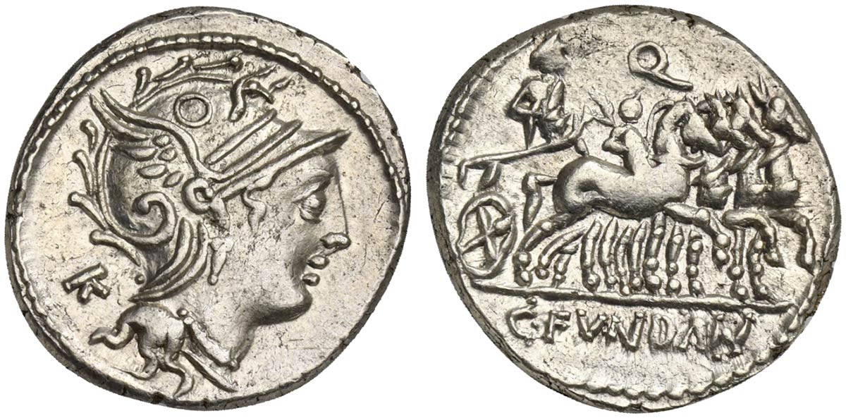 C. Fundanius, Denarius, Rome, 101 BC. AR (g 3,94; mm 19; h 6). Helmeted head of Roma r.; K behind, Rv. Triumphator in quadriga r., holding sceptre and laurel branch; a youth riding the nearest horse, holding laurel branch; Q above