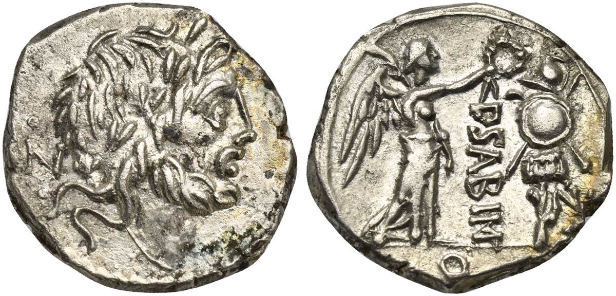 P. Sabinus, Quinarius, Rome, 99 BC. AR (g 1,97; mm 15; h 5). Laureate head of Jupiter r.; N behind, Rv. Victory standing r., crowning trophy with wreath; P•SABIN between, Q in exergue. Crawford 331/1; Vettia 1; Sydenham 587. Good very fine