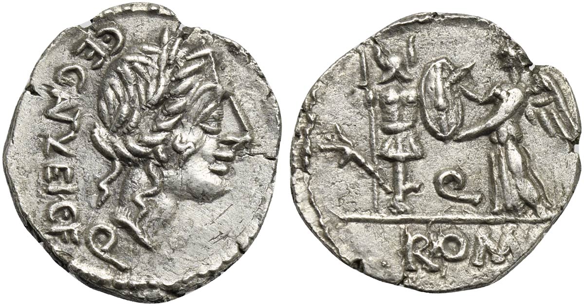 Lot 793 | C. Egnatuleius C.f., Quinarius, Rome, 97 BC. AR (g 1,65; mm 16; h 11). Laureate head of Apollo; C•EG(NAT)(VL)EI•C•F•Q behind, Rv. Victory standing l., inscribing shield attached to trophy; at base, carnyx to l.; Q in field, ROM[A]