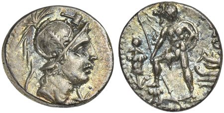 C. Malleolus C.f., Denarius, Rome, 118 BC. AR (g 3,87; mm 17; h 9). Helmeted head of Mars r.; mallet above, denomination mark below chin, Rv. Heroic figure standing l., with r. foot on cuirass, holding spear; trophy to l., grasshopper on prow to r.; [C•M(AL)] to r. Crawford 335/3d; Poblicia 6; Sydenham 615a. Iridescent patina, good very fine