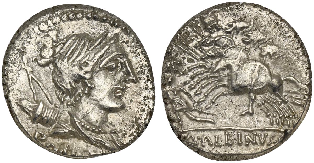 A. Albinus Sp.f., Denarius, Rome, 96 BC. AR (g 3,88; mm 19; h 1). Bust of Diana r.; bow and quiver over shoulder; ROMA below, Rv. Three horsemen galloping l.; fallen warrior before; A•ALBINVS•S•F in exergue. Crawford 335/9; Postumia 4a; Sydenham 613a. Scarce, about very fine