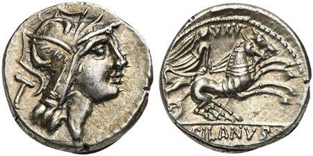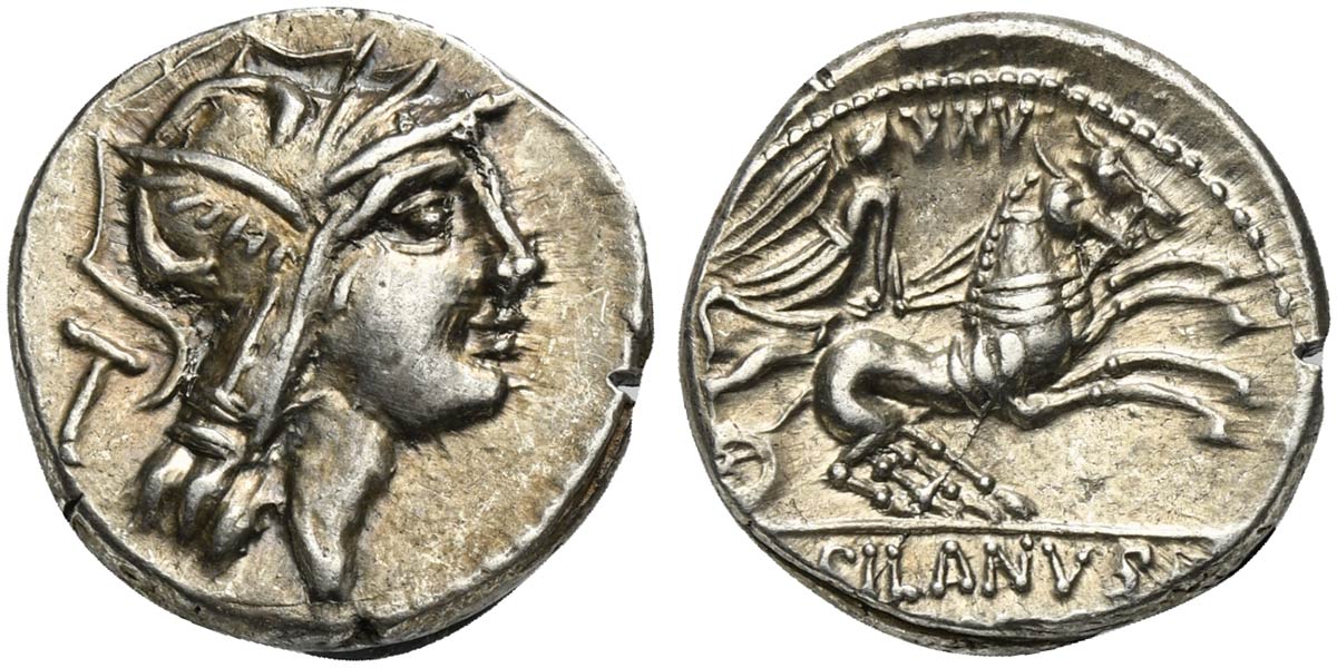 D. Silanus L.f., Denarius, Rome, 91 BC. AR (g 3,97; mm 18; h 4). Helmeted head of Roma r.; T behind, Rv. Victory driving biga r.; XXV above, [D]•SILANVS[…] in exergue. Crawford 337/3; Junia 15; Sydenham 646. About extremely fine