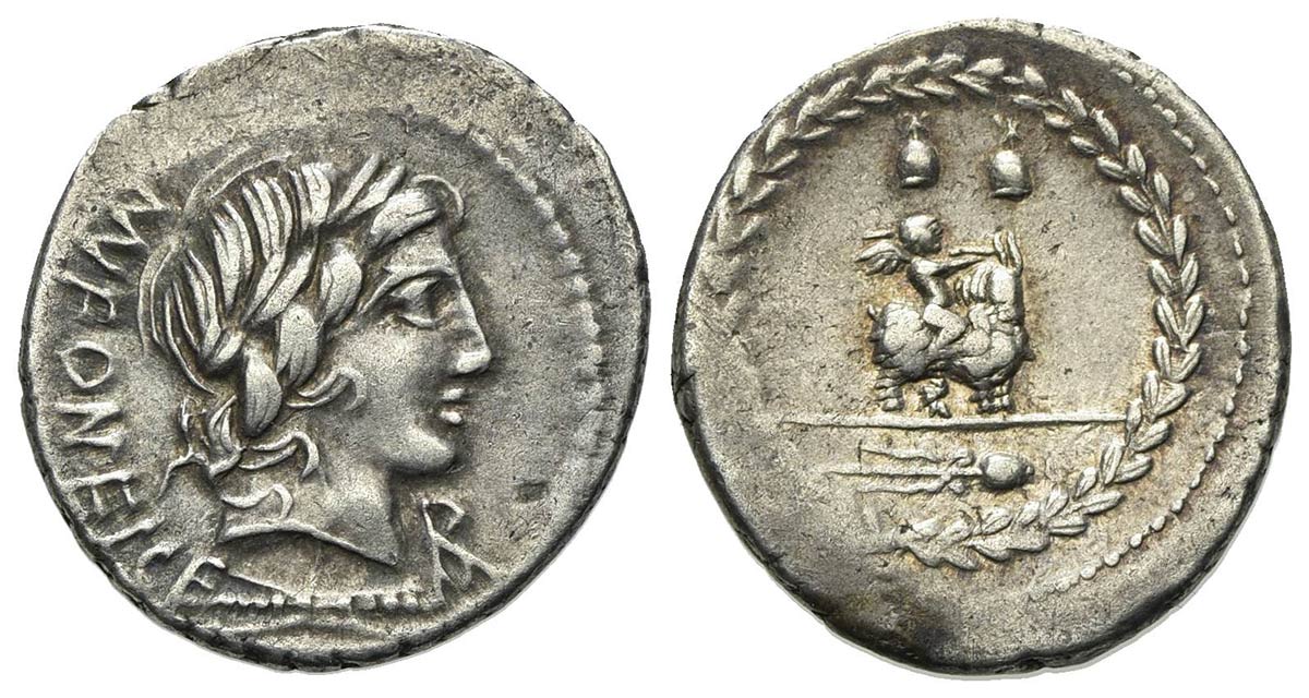 Mn. Fonteius C.f., Denarius, Rome, 85 BC. AR (g 3,85; mm 19; h 5). Laureate head of Vejovis (or Apollo) r.; Roma monogram below chin, thunderbolt below neck. R/ Infant winged Genius seated on goat r.; pilei of the Dioscuri above; filleted thrysus in exergue; all within laurel wreath. Crawford 353/1a; RBW 1350; RSC Fonteia 9. Near VF