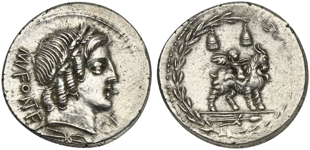 Mn. Fonteius C.f., Denarius, Rome, 85 BC. AR (g 3,67; mm 21; h 6). Laureate head of Vejovis (or Apollo) r.; (MN)•FO(NT)EI behind, thunderbolt below, C•F before, Rv. Infant winged Genius (or Cupid) seated on goat standing r.; pilei of the Dioscuri above, thyrsus with fillet in exergue; all within laurel wreath. Crawford 353/1c; Fonteia 10; Sydenham 724a. Near extremely fine