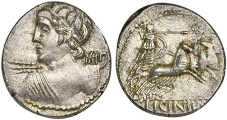 C. Licinius L.f. Macer, Denarius, Rome, 84 BC. AR (g 3,98; mm 20; h 1). Diademed bust of Vejovis l., seen from behind, hurling thunderbolt, Rv. Minerva in quadriga r., brandishing javelin and holding shield; C•LICINIVS[•L•F / MACE
