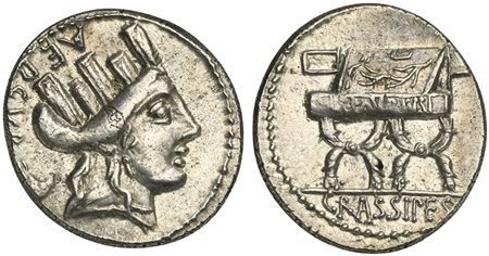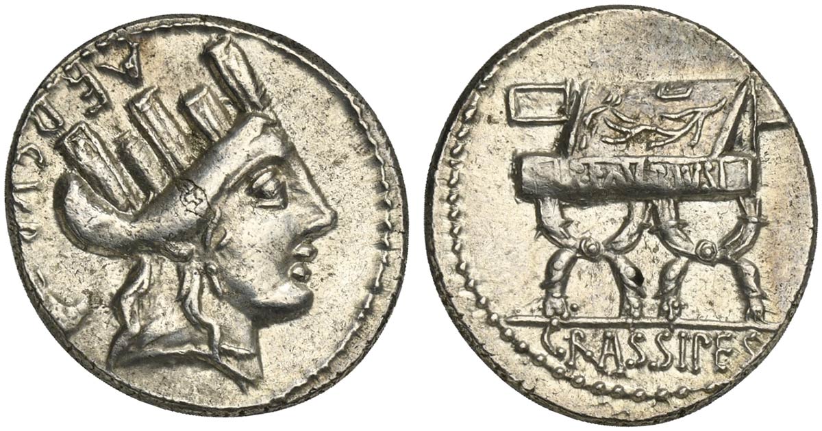 P. Furius Crassipes, Denarius, Rome, 84 BC. AR (g 4,04; mm 19; h 1). Turreted head of Cybele r.; AED•CVR and foot behind, Rv. Curule chair inscribed P•FOVRIVS; CRASSVPES in exergue. Crawford 356/1d; Furia 19a; Sydenham 735. Good very fine