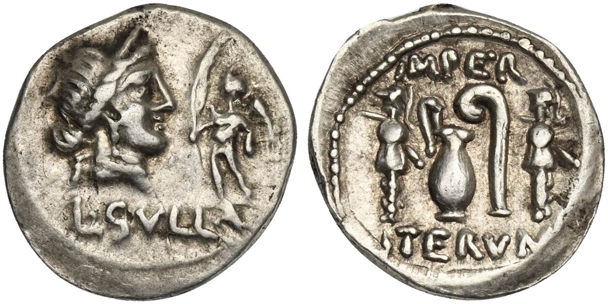L. Sulla, Denarius, military mint, 84-3 BC. AR (g 3,84; mm 20; h 12). Diademed head of Venus r.; to r., Cupid standing l., holding palm frond; L•SVLLA below, Rv. Capis and lituus between two trophies; IMPER above, ITERV below. Cra